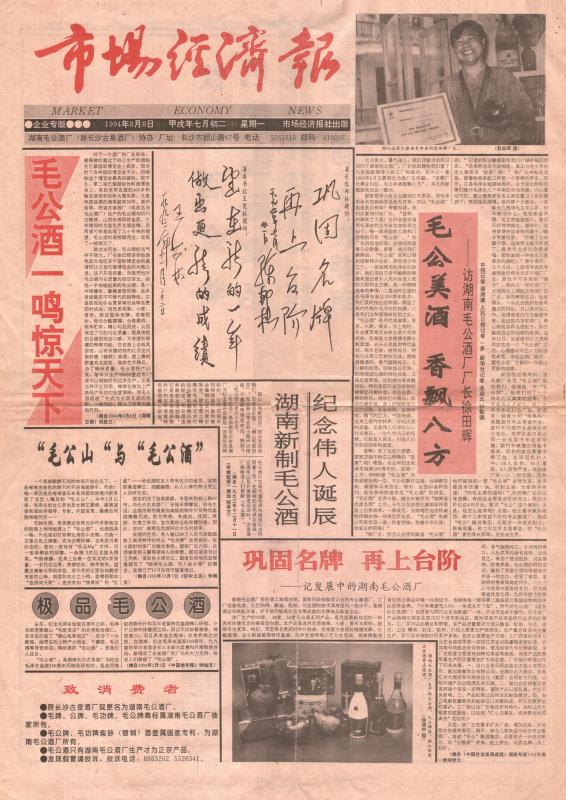 1994年8月8日市场经济报对毛公酒大篇幅的报道。