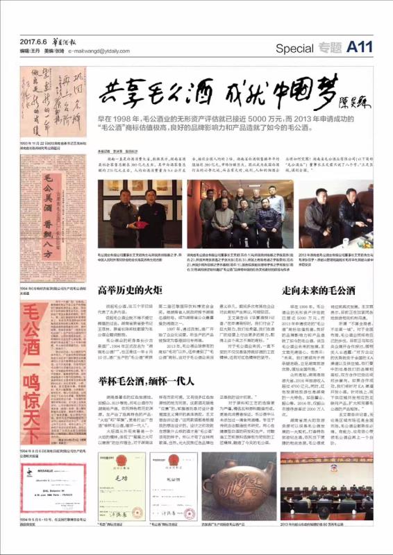 2017年6月6日《华夏酒报》A11整版刊登发表有关毛公酒专题介绍。记者与毛公酒董事长做了专访,详细的介绍了毛公酒的辛酸历程与毛公酒的发展等。
