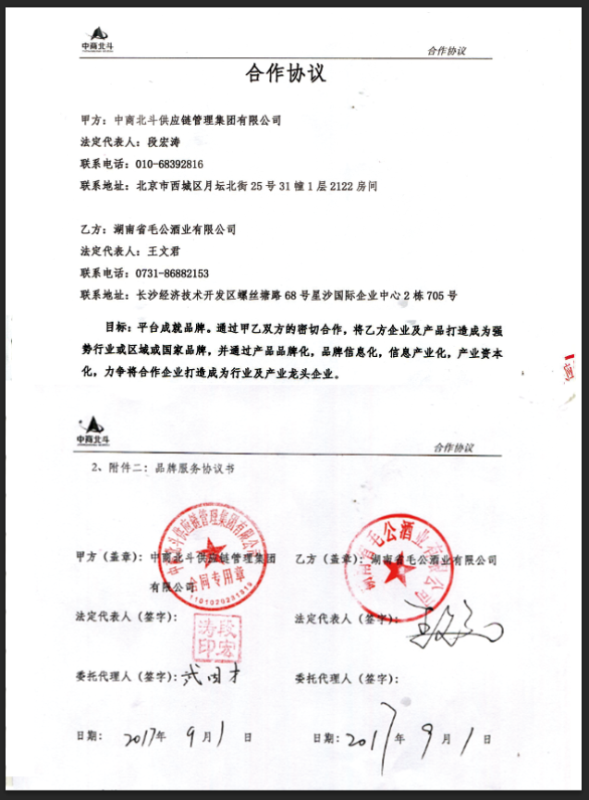 2017年9月,湖南省毛公酒业有限公司与中商北斗供应链管理集团有限公司,在北京签署合作协议,双方共同努力将"毛公酒"打造成为国家品牌。中商北斗供应链管理集团有限公司是中国国有独资企业;是中国商业网点建设开发中心构建的中国商贸流通领域供应链综合运营平台。中国商业网点建设开发中心副主任:段宏涛兼任中商北斗供应链管理集团有限公司总经理。